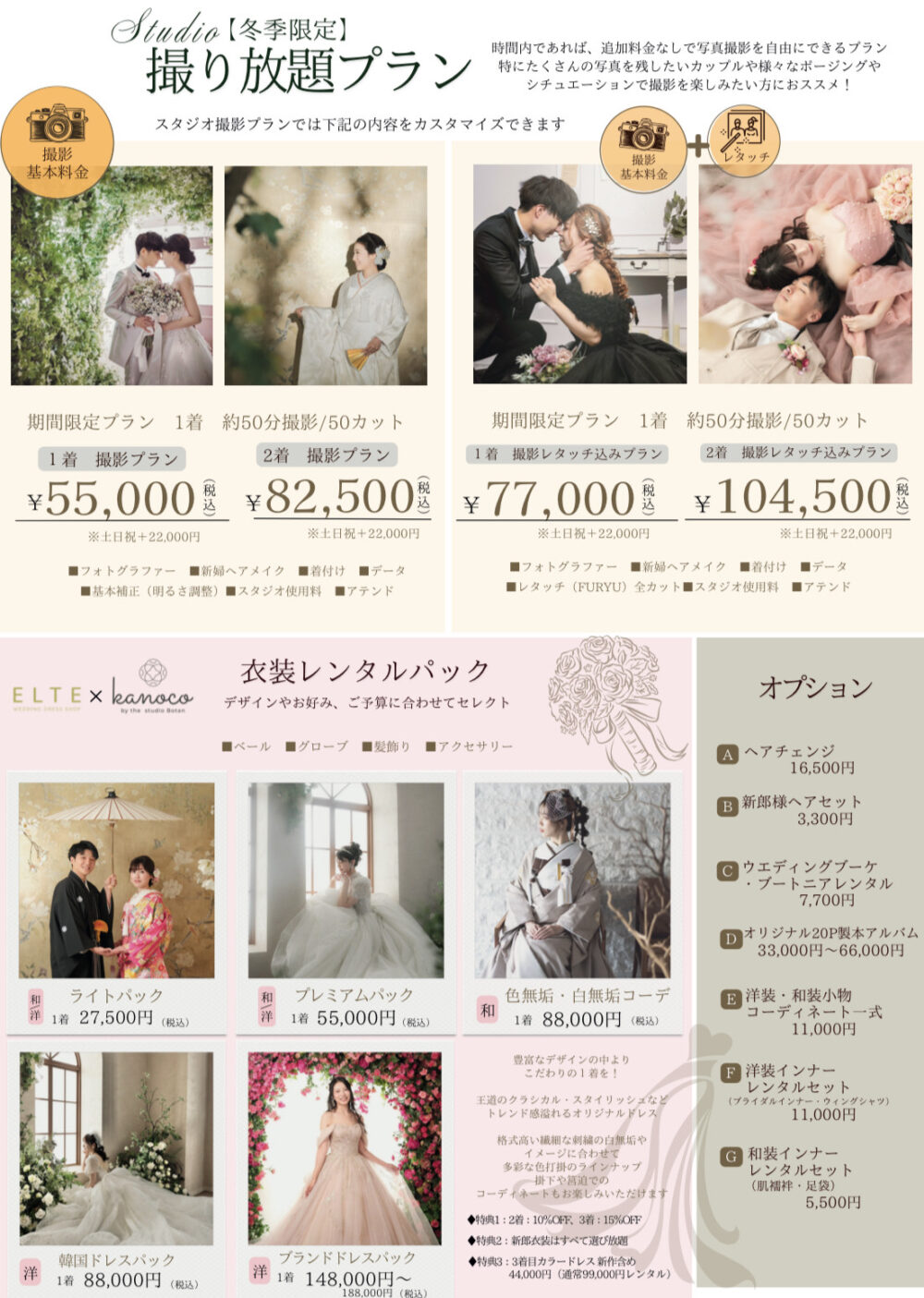 ライトパック(衣装1着)27,500円~【新作】ブランドドレスパック188,000まで各種取り揃えております。